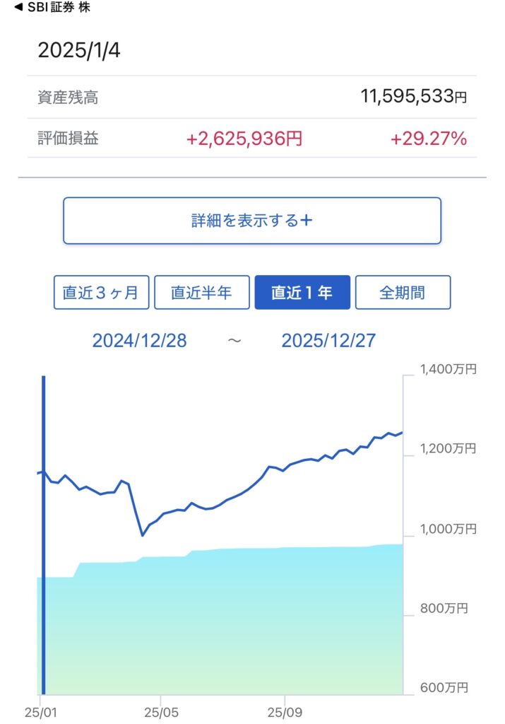 | SBI証券(新NISA含) | 11,595,533円 | 12,575,162円 | +979,629円 |
