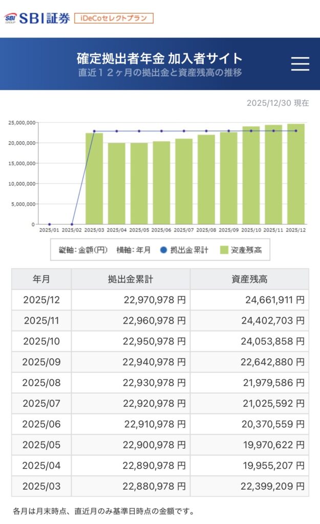 | SBI証券( iDeCo) | 19,955,207円 | 24,661,911円 | +4,706,704円 |