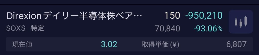 年初の下げに耐えられなくなり売却したことで、約100万円の逸失利益となったことも悔やまれますが、一番の反省点はトランプ関税での下げを利用しようとしてSOXSを購入した直後、90日の関税猶予が発表され一気に70%下げ、そのまま売却のタミングを失ったことでした。現在は−93%となってます。