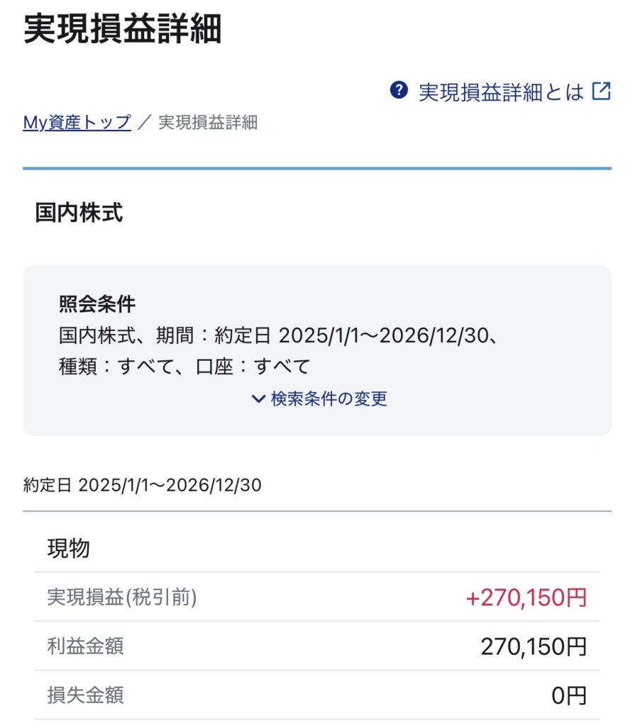| 銘柄(数量) | 平均取得単価 | 売却額 | 実現損益 | 2025/12時点 |