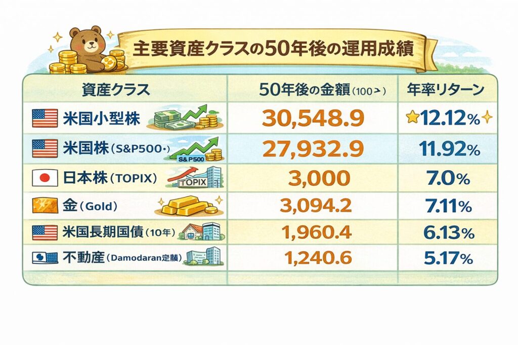 約50年間の各資産の運用成績を比較してみました。