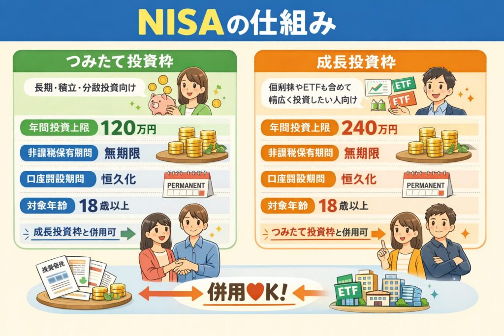 この2つの枠は同じNISA口座の中で併用可能で、年間では合計最大360万円まで投資できます。