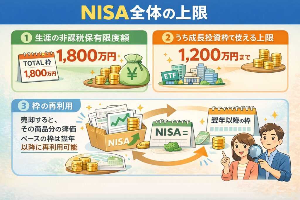NISA全体では1,800万円まで非課税で保有でき、そのうち成長投資枠は1,200万円までです。